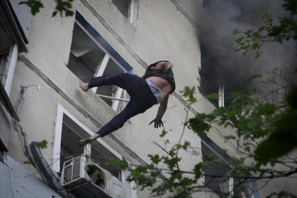 Seorang pria tewas terlempar dari jendela apartemen yang terbakar setelah serangan udara terpandu Rusia di Kharkiv, Ukraina pada 30 Agustus 2024. FOTO/AP