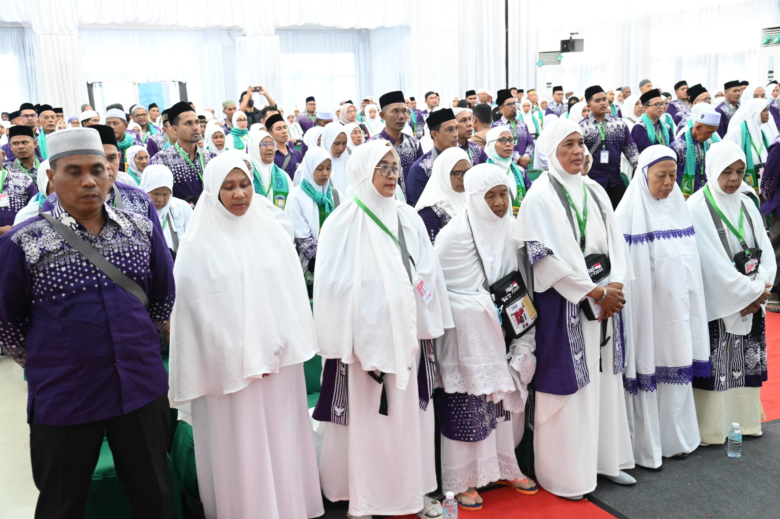 Calon jamaah haji Aceh Besar mengikuti acara penglepasan di Aula Jeddah Asrama Haji Banda Aceh, Selasa (28/05/2025). FOTO/ BEDU SAINI