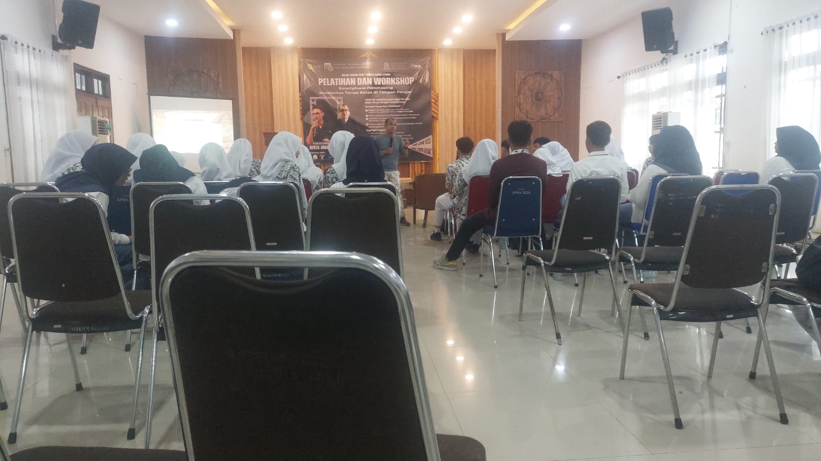 posaceh.com, Banda Aceh – Sebanyak 63 pelajar putra dan putri SMAN 2 Banda Aceh mengikuti pelatihan proses produksi film melalui smartphone atau telepon pintar di aula UPTD Museum Aceh, Banda Aceh, Jumat (17/10/2025) pagi sampai sore.