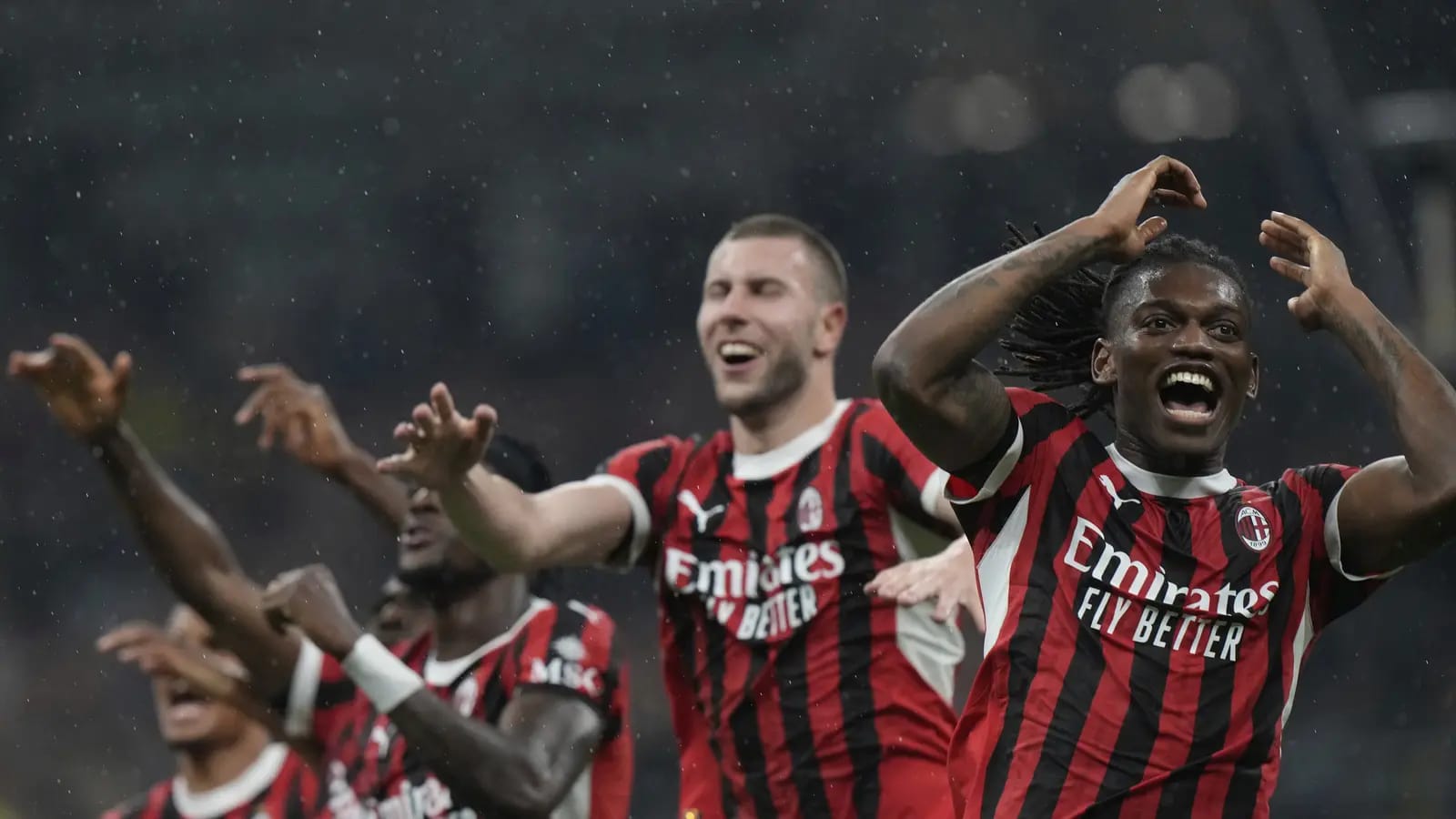 Pemain AC Milan melakukan selebrasi setelah mengalahkan Inter Milan pada semifinal Coppa Italia, Kamis (24/4/2025) dini hari WIB. FOTO/AP