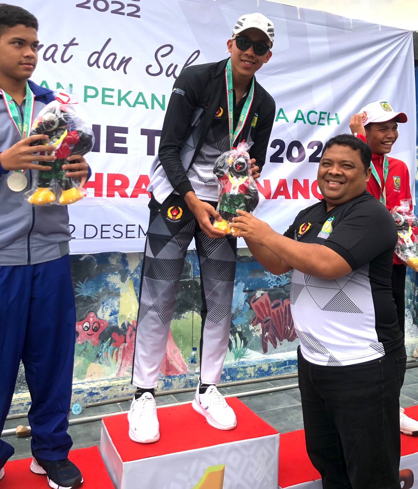 Sekretaris Daerah (Sekda) Aceh Besar Drs, Sulaimi, MSi, mengalungkan medali emas kepada atlet renang Kabupaten Aceh Besar, Senin (19/12/2022). FOTO/MC ACEH BESAR
