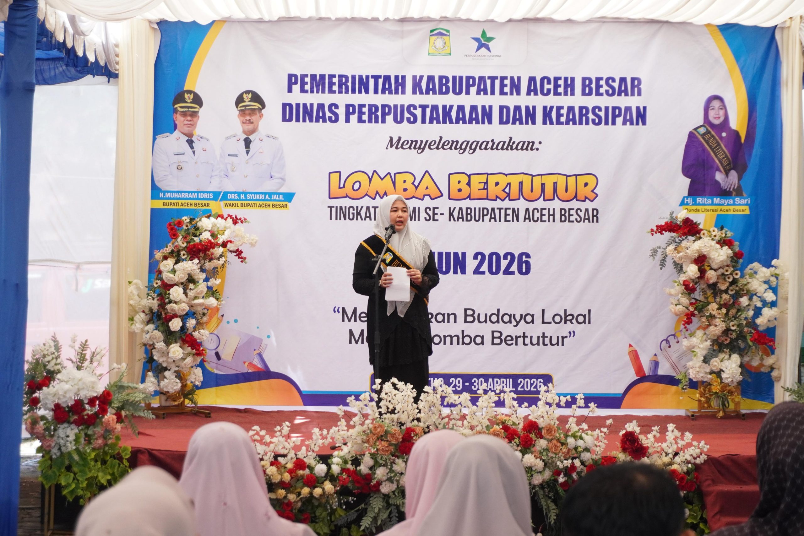 Lomba bertutur yang diikuti 50 peserta didik perwakilan SD/MI itu, dibuka oleh Bunda Literasi Aceh Besar Hj Rita Mayasari di halaman Dinas Perpustakaan dan Kearsipan Aceh Besar, Kota Jantho, Rabu (29/4/2026).