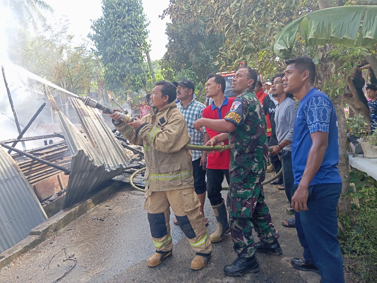 posaceh.com, Kota Jantho – Personel Lanud Sultan Iskandar Muda bersama masyarakat membantu Tim pemadam kebakaran padamkan api yang membakar dua rumah warga di Gamong Cot Karieng, Kecamatan Blang Bintang, Aceh Besar, Kamis (15/8/2024) pagi.