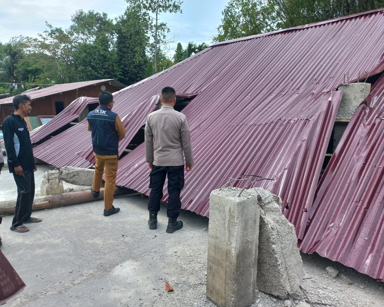 Atap bangunan Balai Pengajian Dayah Nurul Fathani Gampong Dayah Lampoh Awe, di Kecamatan Simpang Tiga kabupaten Pidie, ambruk akibat angin puting beliung, Selasa (09/5/2023). FOTO/ HARMADI