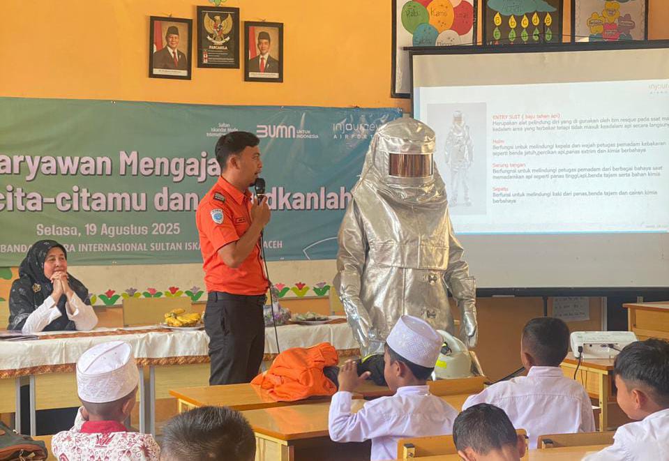 posaceh.com, Kota Jantho – PT Angkasa Pura Indonesia Bandara Sultan Iskandar Muda (SIM) melalui Tim Fire Fighting memberikan edukasi keselamatan penerbangan kepada 50 siswa Sekolah Dasar Negeri (SDN) Bueng Cala, Kecamatan Kuta Baro, Aceh Besar, Rabu (20/08/2025).