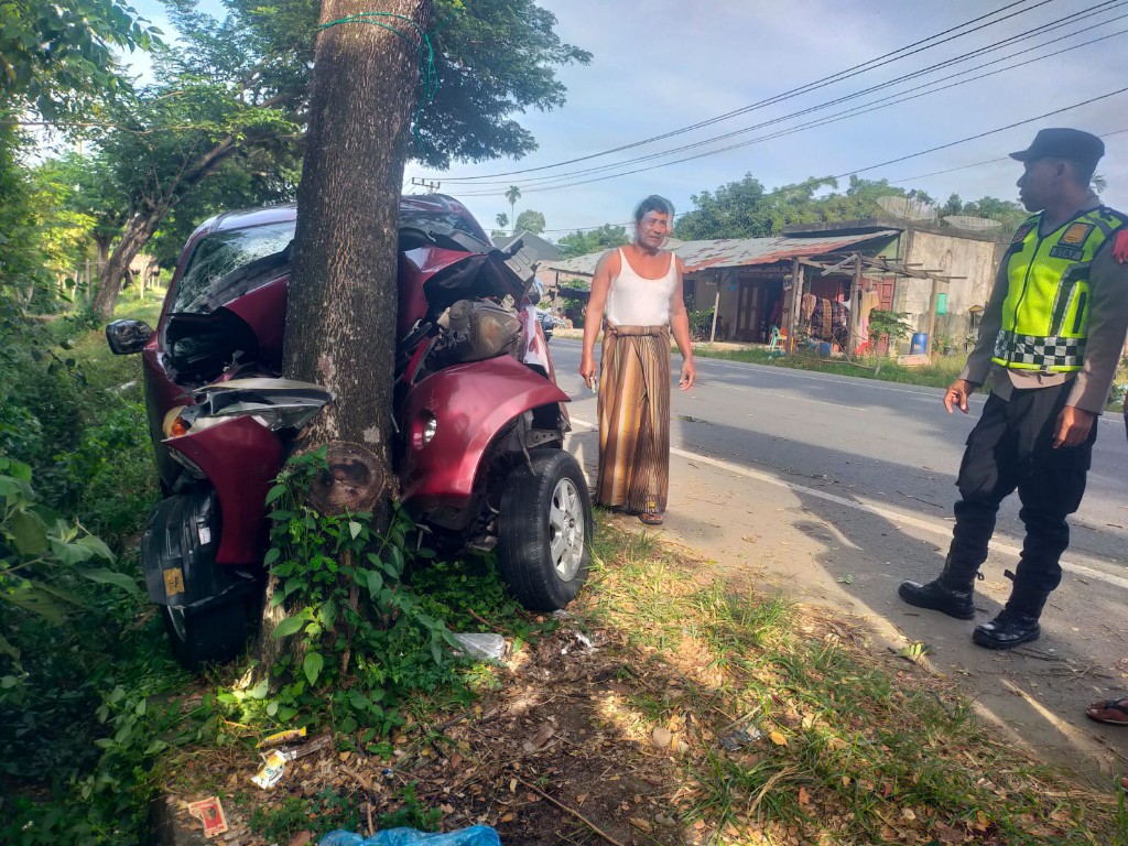 Mobil Avanza dengan nomor polisi BL 1280 FD yang dikemudikan Arahman Ibrahim (51) mengalami kecelakaan tunggal setelah menabrak pohon di Paru Keude, Kecamatan Bandar Baru, Pidie Jaya, Selasa (7/11/2023).