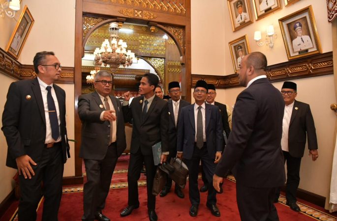 Pj Gubernur Aceh Bustami Hamzah berbincang dengan Pj Bupati/Walikota dan Plh Dirut Bank Aceh usai RUPS Bank Aceh tahun buku 2023, di Pendopo Gubernur Aceh, Minggu (5/5/2024).