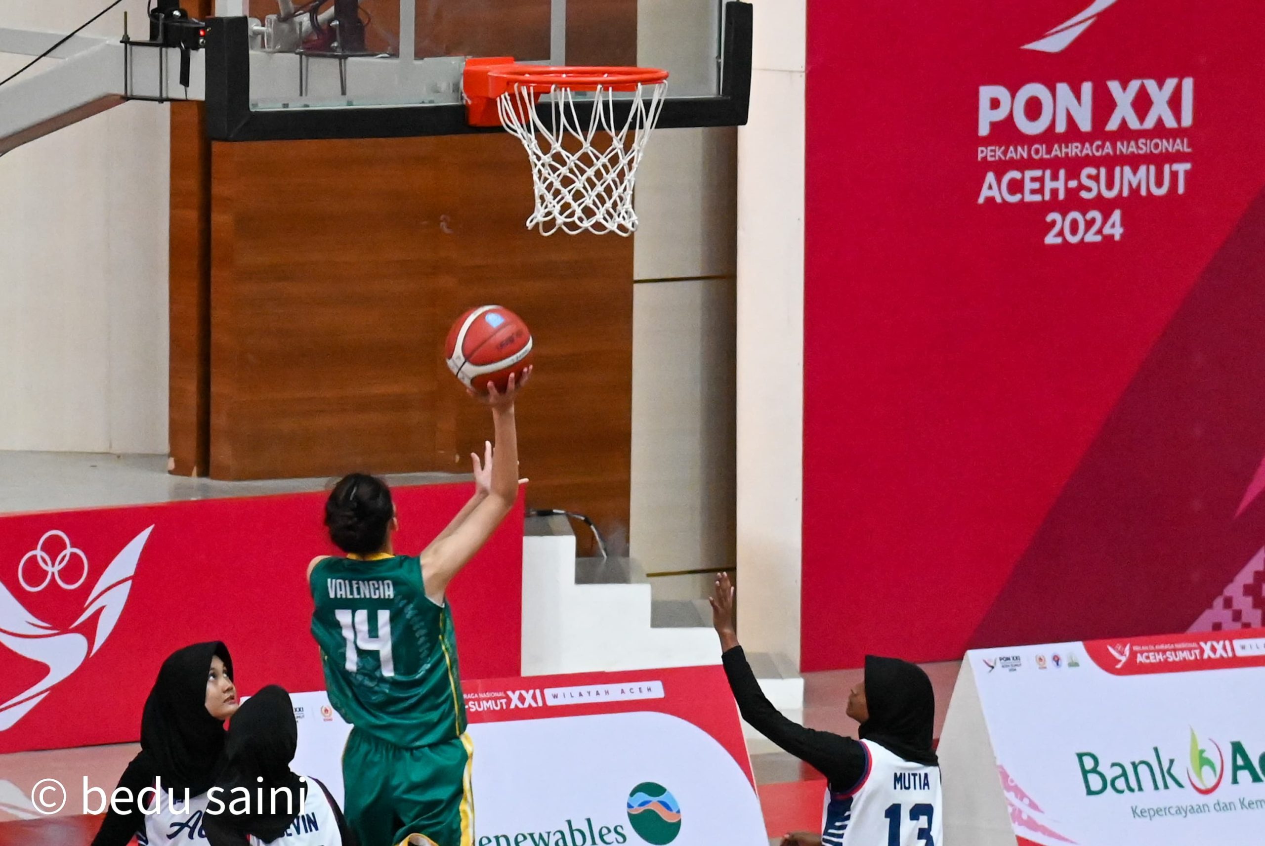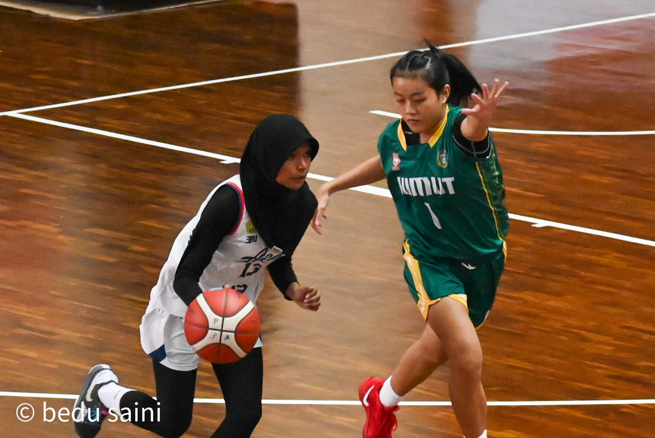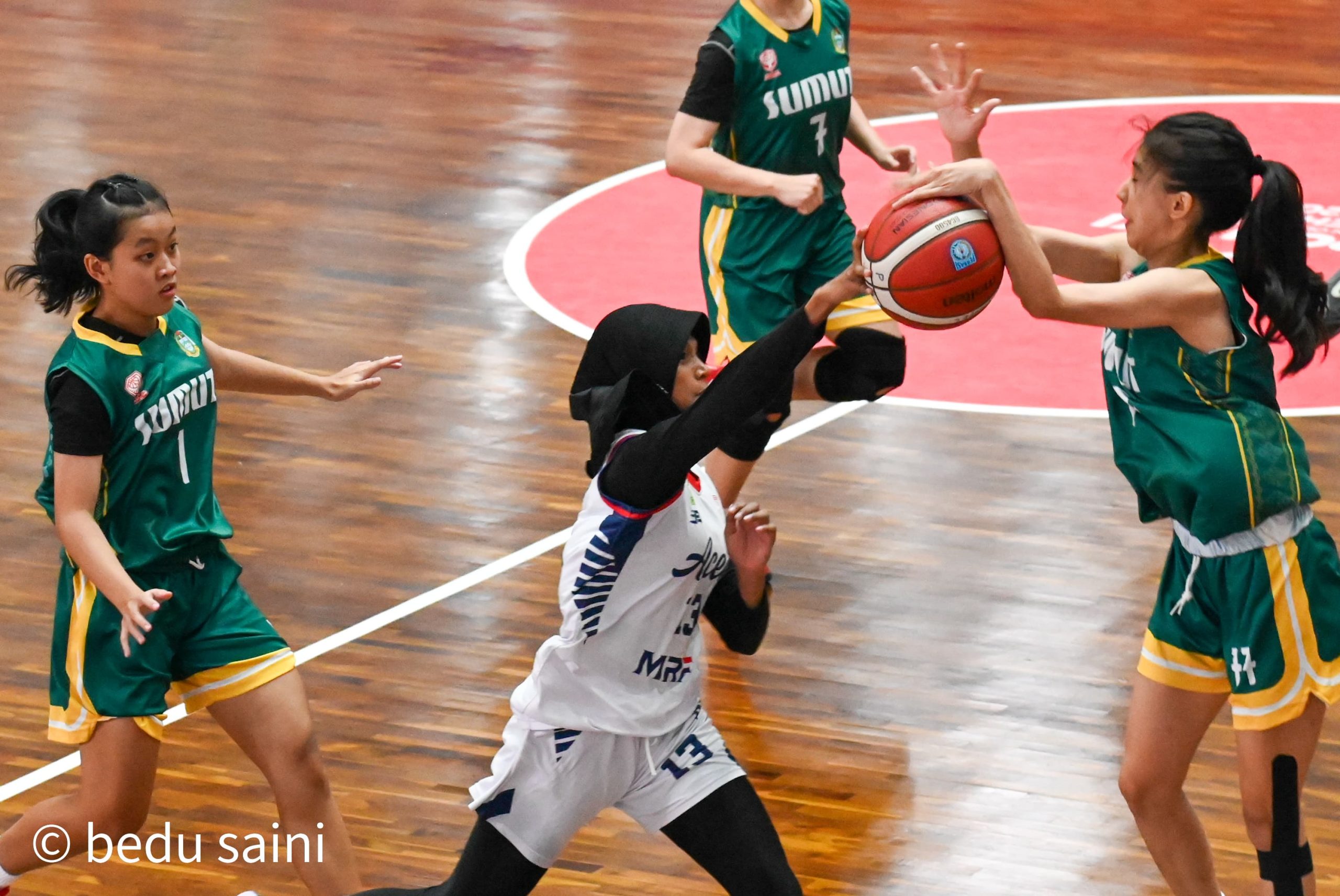 BASKET PUTRI - Grup B Pemain Tim basket putri Aceh (kaus putih) melawan pemain putri Sumut di GOR Harapan Bangsa, Banda Aceh, Sabtu (07/09/2024). FOTO/BEDU SAINI
