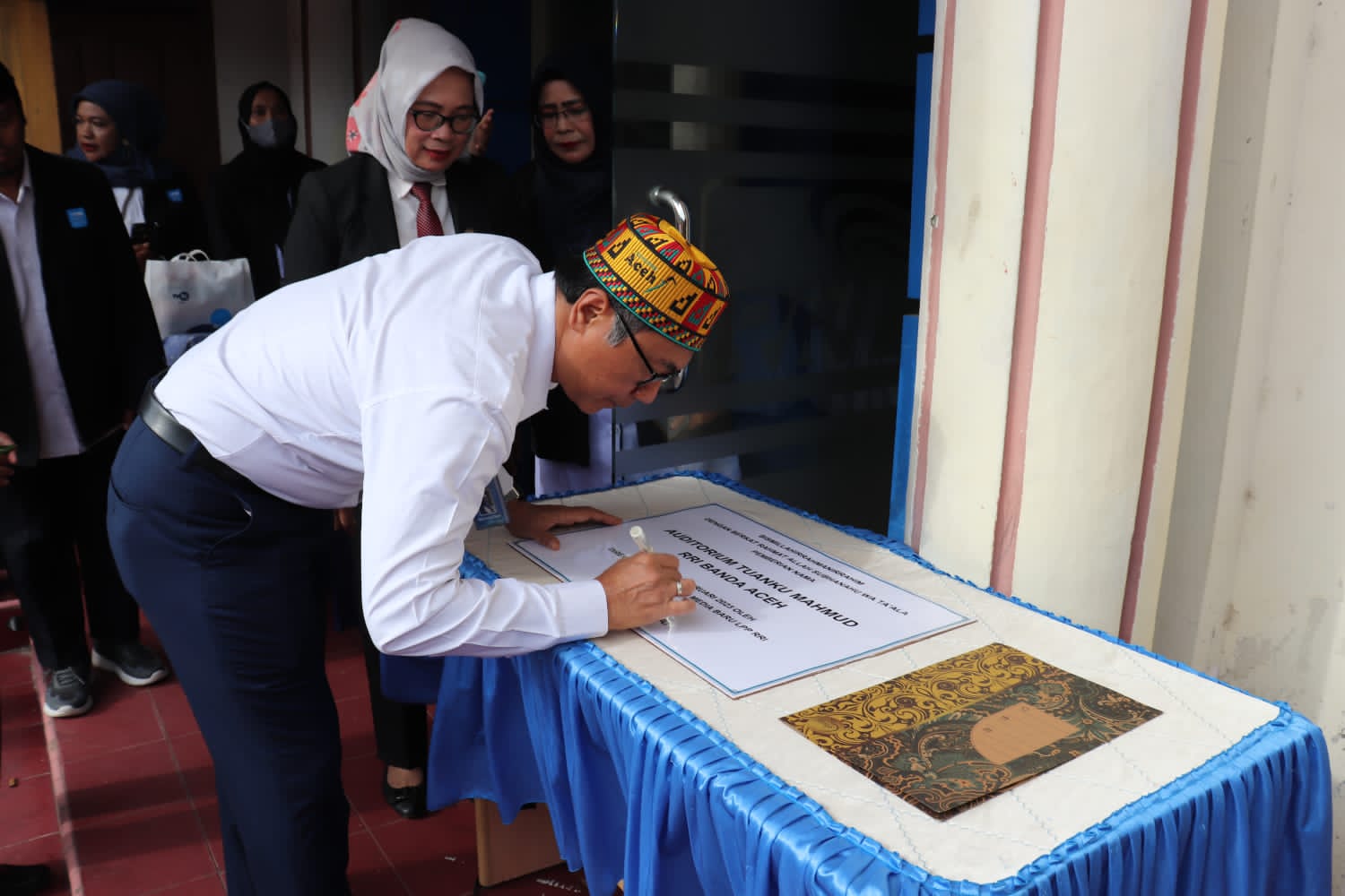 Direktur Tehnik dan Media Baru (TMB) RRI Muhammad Sujai melakukan penandatanganan prasasti nama Auditorium RRI Banda Aceh menjadi Auditorium Tuanku Mahmud RRI Banda Aceh, Senin (13/2/2023).FOTO/ DOK RRI BANDA ACEH