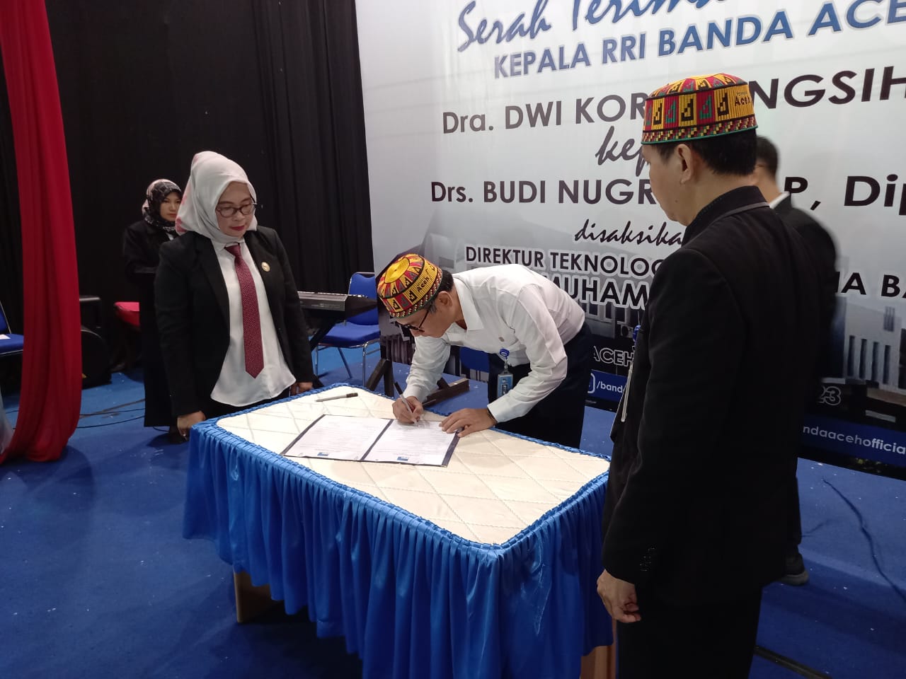 posaceh.com, Banda Aceh – Jabatan Kepala LPP RRI Banda Aceh diserahterimakan dari pejabat lama Dra Dwi Korianingsih MA kepada pengantinya Dr Budi Nugroho P Dipl Jur dalam sebuah acara di Auditorium Tuanku Mahmud RRI setempat, Senin (13/2/2023). Dwi Korianingsih mendapat tugas baru sebagai Kepala RRI Palangka Raya Kalimantan Tengah, sementara pengantinya Budi Nugroho sebelumnya bertugas sebagai kepala RRI Purwokerto Jawa Tengah.