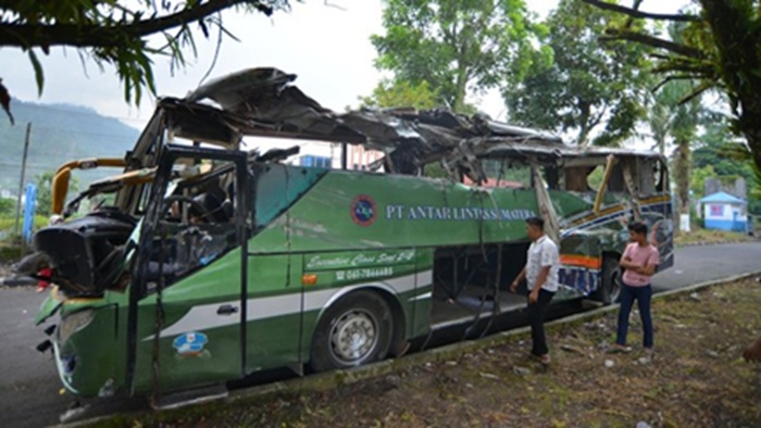 Saat itu, pengemudi bus berusaha mengendalikan kendaraannya hingga sampai di simpang Terminal Busur. Namun, saat melewati terminal, kendaraan tersebut oleng ke kiri. “Melewati simpang Terminal Busur dalam keadaan rem tidak tidak berfungsi kendaraan tersebut oleng ke kiri dan menabrak pagar rumah warga yang berada di sisi kiri jalan,” ucap Reza.