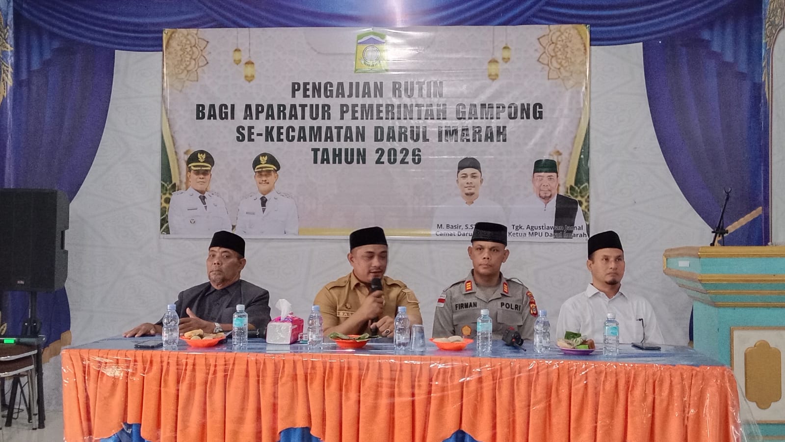 Camat Darul Imarah, Muhammad Basir SSTP MSi menyampaikan arahan dan sambutan pada pengajian rutin di Gedung UDKP, Selasa (28/4/2026), sebagai bagian penguatan nilai keislaman dan integritas pemerintahan. FOTO/ MUHAMMAD