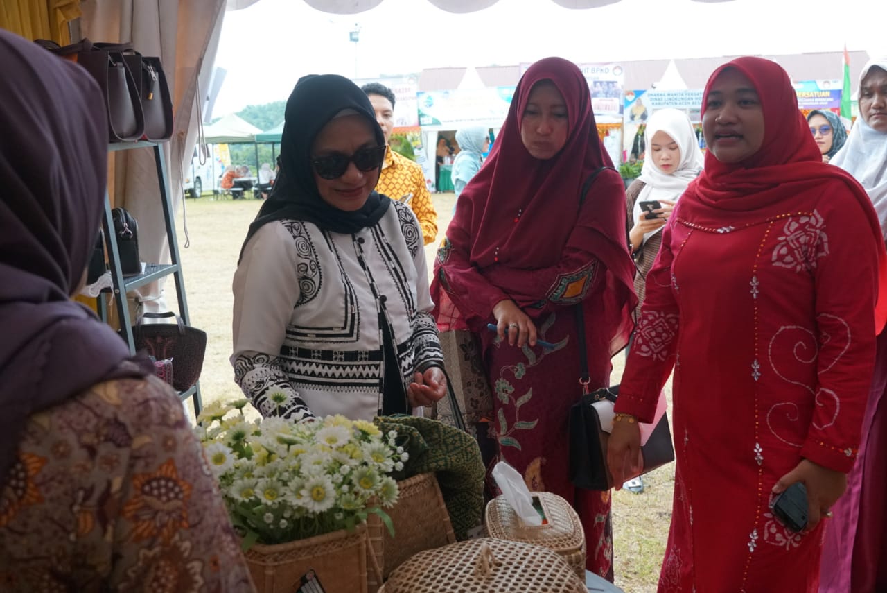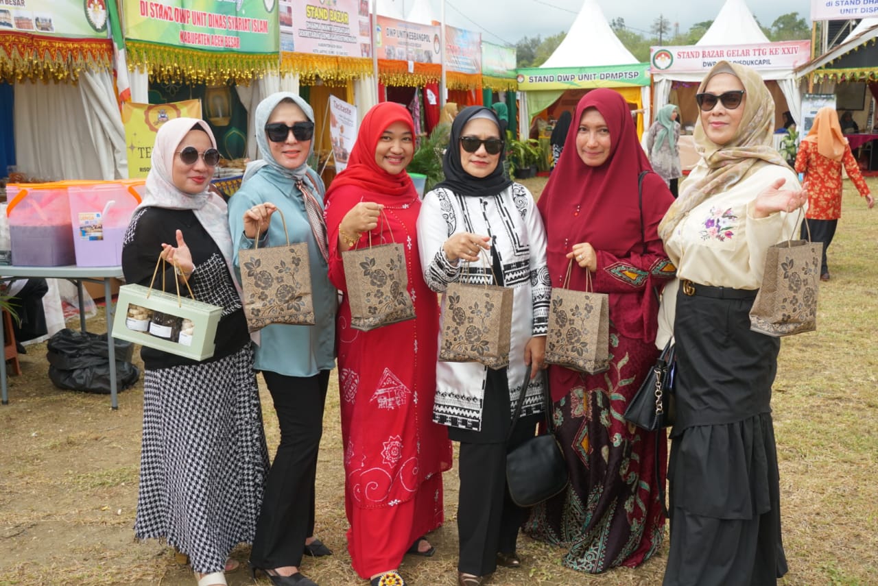 Pj Ketua TP PKK Aceh Besar Cut Rezky Handayani SIP MM foto bersama usai perkenalkan produk unggulan Aceh Besar kepada Pj Ketua TP PKK Aceh Tengah, Ny Novita Mirzuan saat mengunjungi Stand Pameran Dharma Wanita di kompleks TTG XXIV Aceh di JSC Kota Jantho, Rabu (31/5/2023).