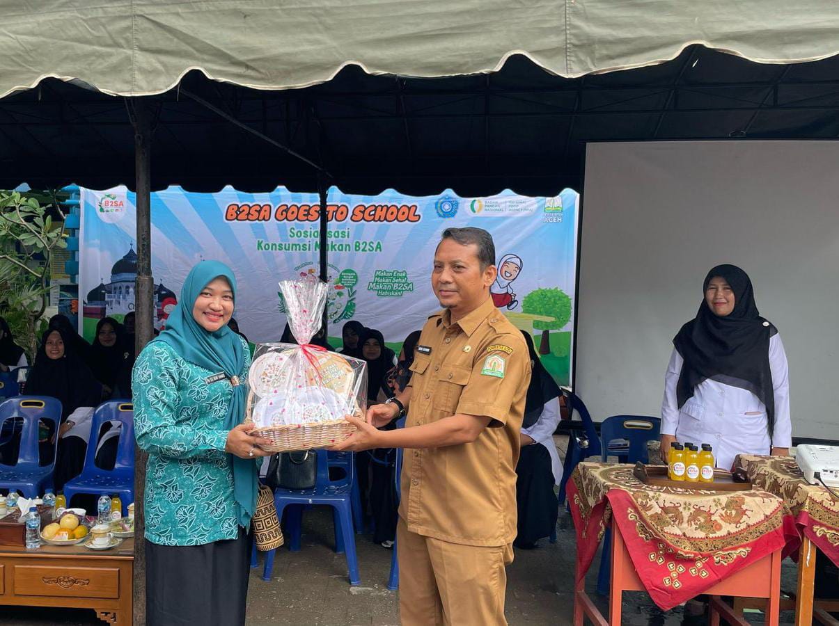 Pj Ketua TP PKK Aceh Besar Cut Rezky Handayani menerima cinderamata berupa makanan B2SA dari Plt. Kadis Pangan Aceh Surya Rayendra usai membuka kegiatan Sosialisasi Konsumsi Makanan B2SA (Beragam, Bergizi, Seimbang dan Aman) yang dilaksanakan di Halaman MIN 27 Aceh Besar, Senin (25/9/2023).