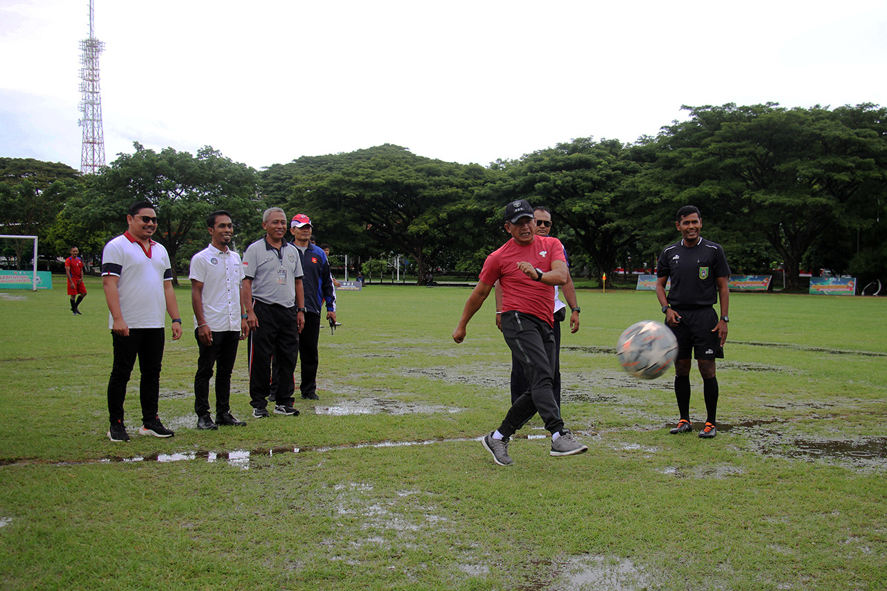 Dandim 0101/KBA Kolonel Inf Muhammad Nas, S.I.P., M.Si melakukan tendangan pembuka laga perdana antara Lueng Bata FC versus Baiturrahman FC pada Turnamen sepakbola Piala Dandim 0101 Cup Tahun 2022 di Lapangan Blang Padang, Kota Banda Aceh, Selasa (2/8/2022). FOTO/ DOK KODIM 0101/KBA