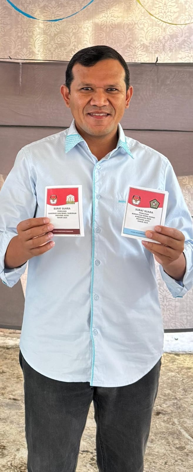 posaceh.com, Sigli – Calon Wakil Gubernur Kesayangan Rakyat Aceh H Fadhlullah, SE, (Dek Fadh) melakukan pencoblosan untuk memilih Gubernur dan Wagub Aceh serta Bupati dan Wakil Bupati Pidie di salah satu Tempat Pemilihan Suara (TPS) di Pidie, Rabu (27/11/2024).