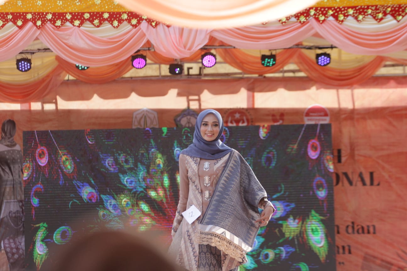 Model Dekranasda Aceh Besar Ulyaa Munawarah sedang menampilkan Tudung Saji pada event Fashion Show pada Rakerda Dekranasda dan Pameran Unggulan Kabupaten/Kota Se-Aceh Tahun 2023 di Ruang Terbuka Hijau (RTH), Tapaktuan, Kabupaten Aceh Selatan, Kamis (15/6/2023) sore.
