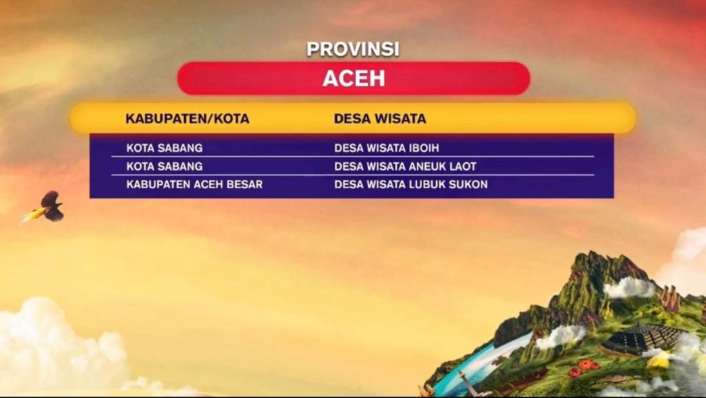 Selain dua desa wisata tersebut, ada Desa Wisata Lubuk Sukun di Kabupaten Aceh besar yang juga menjadi perwakilan desa wisata dari Provinsi Aceh setelah berhasil lolos ke 75 besar ADWI 2023.