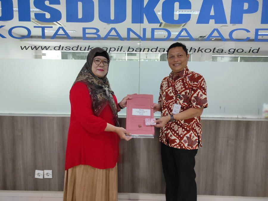 Kadisdukcapil) Kota Banda Aceh, Heru Triwijanarko SSTP MSi menyerahkan 27 keping KIA kepada Kepala Sekolah TK Permata Bunda Punge Blang Cut, Amalia di Kantor Disdukcapil Banda Aceh, Kamis (9/4/2026). FOTO/ TAMAM RIZKY