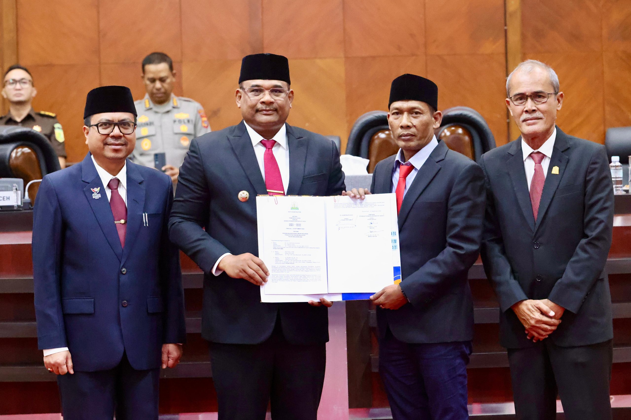 dan Ketua DPRA Zulfadli dengan disaksikan Plh Sekda Aceh, Wakil Ketua DPRA Dalimi serta segenap para peserta paripurna yang hadir menandatangani nota kesepakatan bersama terhadap rancangan perubahan Kebijakan Umum Anggaran (KUA) dan Prioritas Plafon Anggaran Sementara (PPAS) tahun anggaran 2024, dalam rapat paripurna yang berlangsung di Gedung DPRA, Banda Aceh, Senin (23/9/2024).