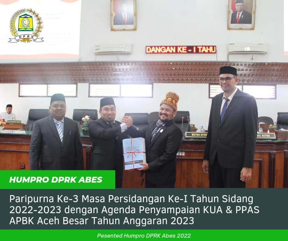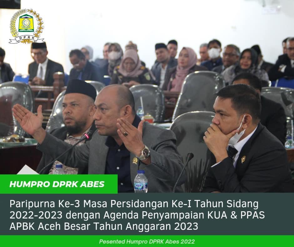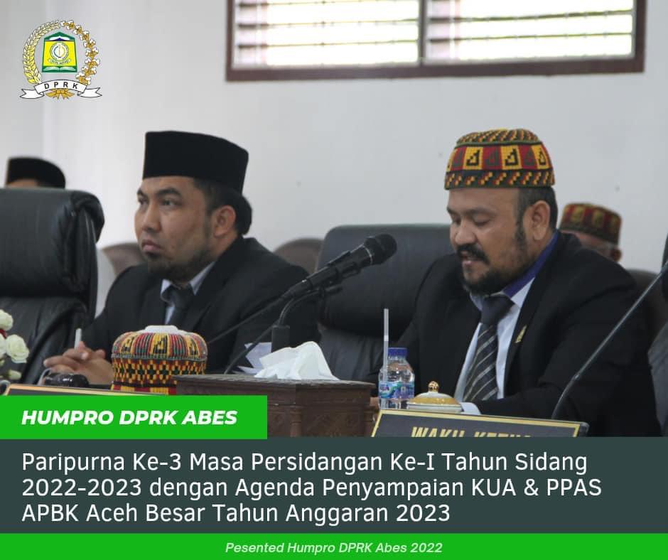 Paripurna Ke-3 Masa Persidangan Ke-I Tahun Sidang 2022-2023 ini dipimpin Ketua DPRK Aceh Besar Iskandar Ali, S.Pd.,M.Si beserta delapan belas (18) anggota DPR mewakili fraksi-fraksi DPRK Aceh Besar. Turut hadir Penjabat (Pj) Bupati Aceh Besar Muhammad Iswanto, S.STP.,MM, Forkopimda, Sekdakab Aceh Besar Drs Sulaimi MSi, para Staf Ahli Bupati, para Asisten Setdakab, Sekretaris DPRK Fata Muhammad, S.Pd.I.,MM, para kepala OPD dan camat.