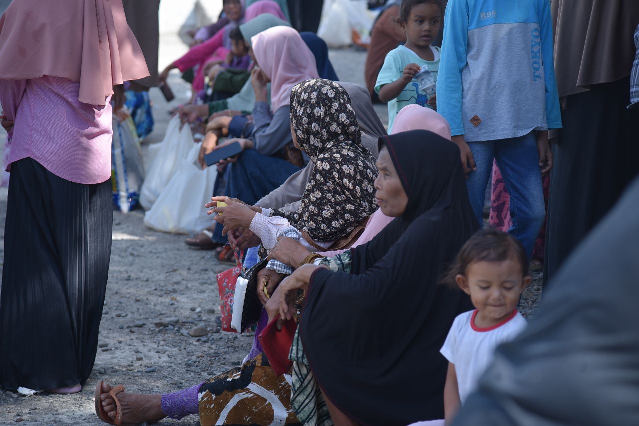 Ibu-ibu beristirahat usai antri dan belanja di pasar murah yang diselenggarakan oleh Pemkab Aceh Besar melalui Diskopukmdag Aceh Besar bekerja sama dengan Disperindag Aceh dan Bulog Aceh, di Halaman Masjid Beungcala, Kecamatan Kuta Baro, Kamis (15/6/2023). FOTO/ ABDUL MUIZ