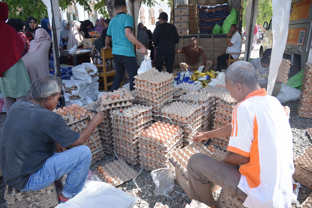Petugas pasar murah memilih telur yang layak untuk diperdagangkan di pasar murah yang diselenggarakan di Halaman Masjid Beungcala, Kecamatan Kuta Baro, Kamis (15/6/2023). FOTO/ ABDUL MUIZ