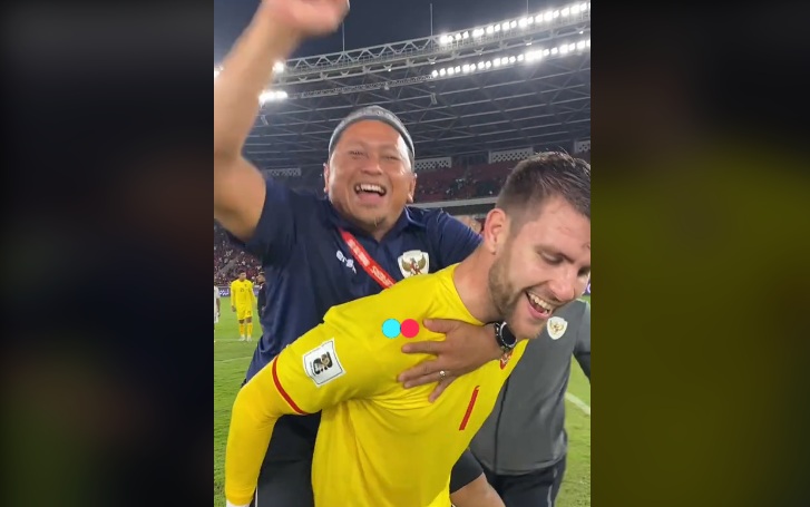 Kiper Timnas Indonesia, Maarten Paes menggendong Pak Udin seorang staff meassure timnas seusai laga melawan Arab Saudi di Stadion Gelora Bung Karna pada 19 November. FOTO/SCREENSHOT