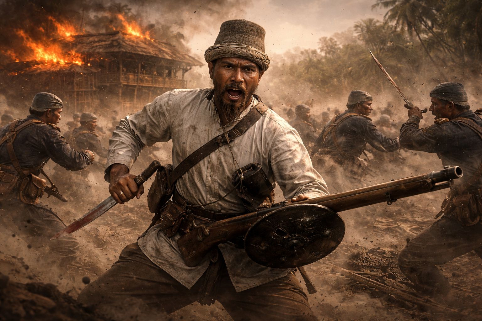Ketika tembakan pertama pecah di udara subuh, perang tidak berlangsung lama dalam bentuk yang biasa. Senapan menjadi terlalu panjang, peluru terlalu lambat. Dalam sekejap, pertempuran berubah menjadi apa yang paling purba: satu lawan satu.