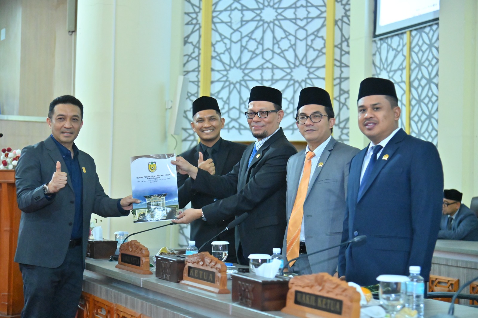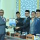 Wakil Ketua Fraksi Demokrat DPRK Banda Aceh Royes Ruslan menyerahkan pendapat akhir Fraksi Demokrat pada rapat paripurna terhadap Rancangan Qanun Usulan Wali Kota Banda Aceh dan Perubahan Atas Qanun Nomor 1 Tahun 2024 Tentang Pajak Dan Retribusi Kota kepada pimpinan rapat paripurna DPRK Banda Aceh, Kamis (31/7/2025). FOTO/ HUMAS DPRK BANDA ACEH
