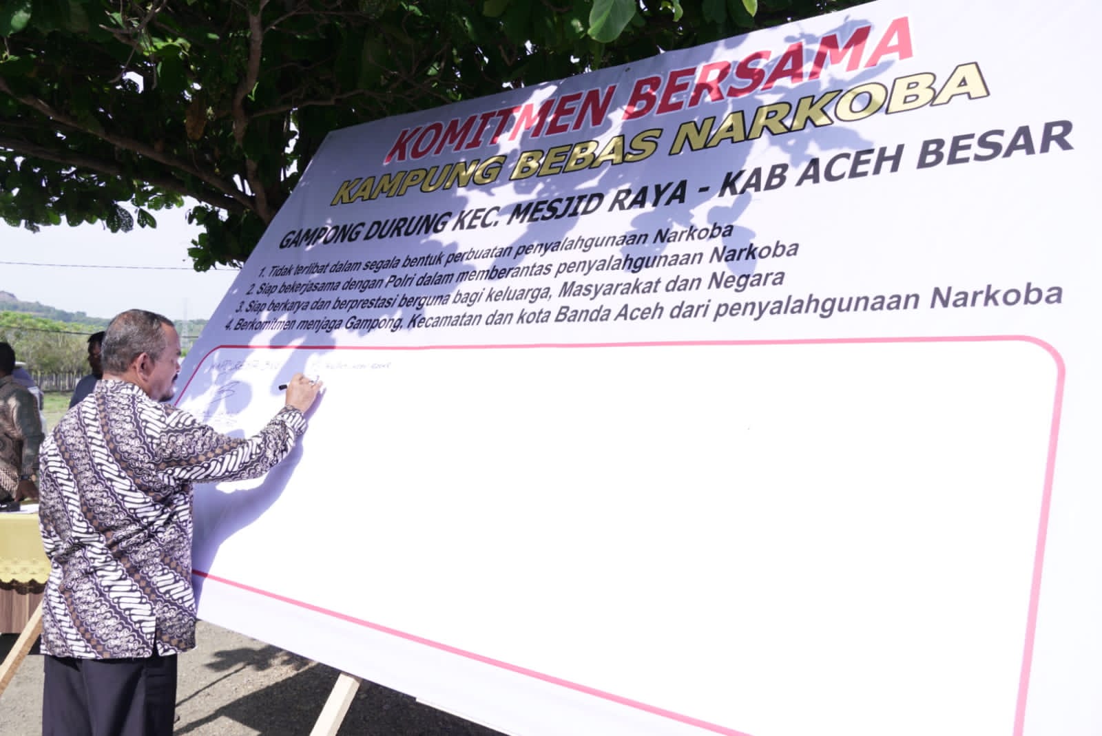 Wakili Pj Bupati, Asisten II Setdakab Aceh Besar M Ali S.Sos MM tandatangani ikrar bersama desa Durung sebagai gampong bebas Narkoba tahun 2024 di Durung, Kecamatan Mesjid Raya, Sabtu (9/3/2024). FOTO/ MAMAD