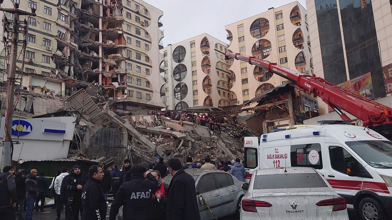 Petugas penyelamat dan tim medis berusaha menemukan warga yang terjebak di bangunan yang runtuh setelah gempa bumi di Diyarbakir, Turki, Senin (6/2/2023). FOTO/AP PHOTO/MAHMUT BOZARSAN