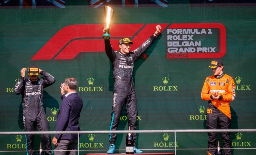 Pembalap Formula Satu (F10 dari tim Mercedes, George Russell, merayakan kemenangan di GP Belgia 2024. Russell finis tercepat dengan catatan waktu 1 jam 19 menit 57,040 detik, Ahad (28/7/2024)