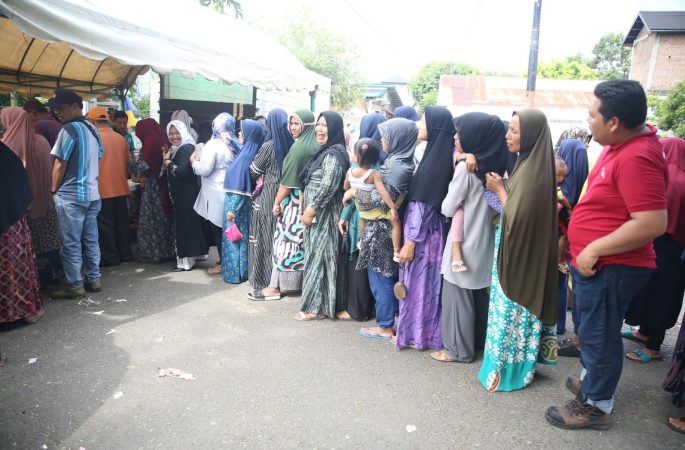 Warga antri berbelanja pada pasar murah yang digelar Pemkab Aceh Besar dan Perum Bulog Kanwil Aceh di Gampong Mon Ikeun, Kecamatan Lhoknga, Aceh Besar, Kamis (08/06/2023). FOTO/ BEDU SAINI