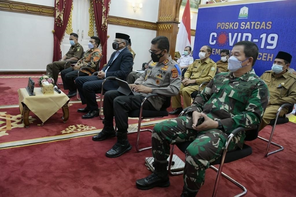 posaceh.com, Banda Aceh – Gubernur Aceh Nova Iriansyah mengikuti rapat koordinasi kepala daerah secara virtual terkait penanganan Covid-19 bersama sejumlah kementerian dan institusi di Meuligoe Gubernur Aceh, Senin (03/05/ 2021.