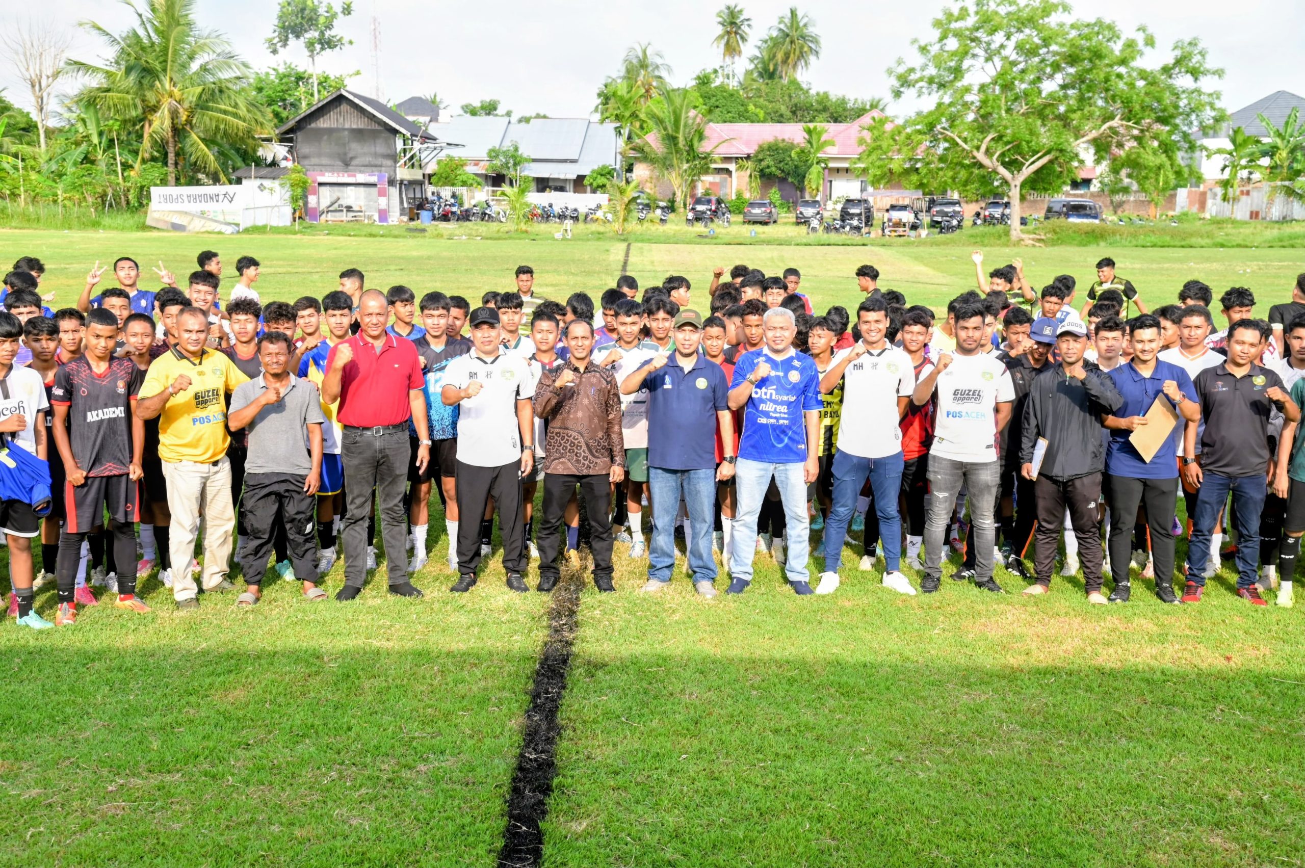 Ketua DPRK Aceh Besar, Plt Kadispapora, Ketua Umum KONI Aceh Besar dan Plt Ketua PSAB Mariadi ST MM, foto bersama peserta calon pemain pemain PSAB U 17 di Lapangan Sepak Bola Persima Gampong Meunasah Kreung, Kecamatan Ingin Jaya, Aceh Besar, Kamis (23/04/2026). FOTO/ BEDU SAINI