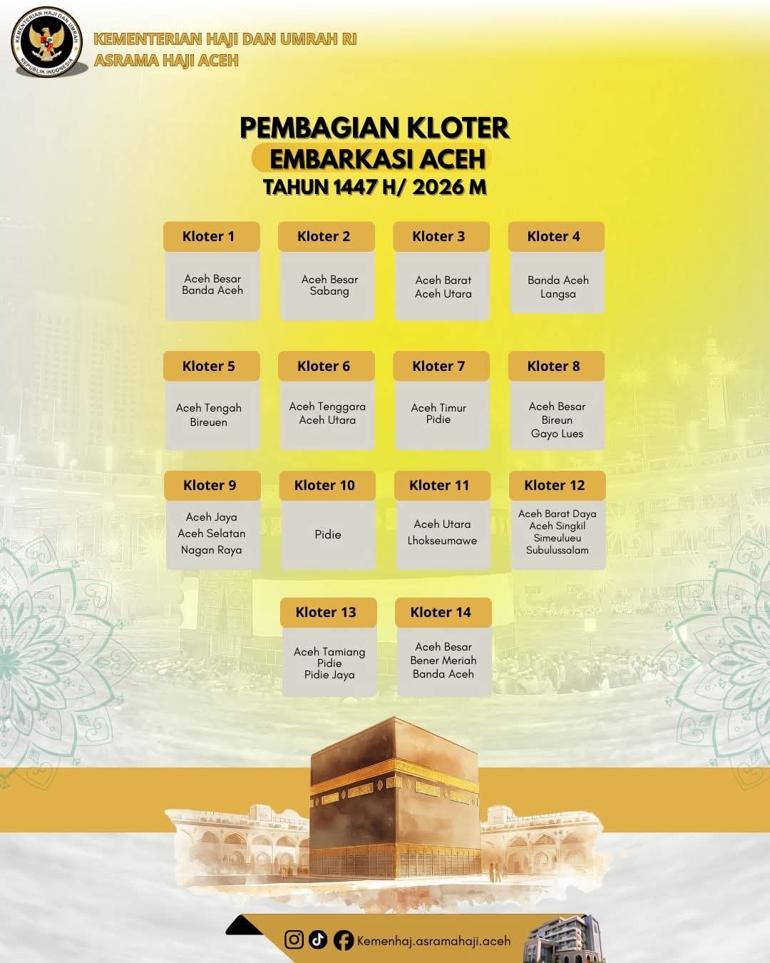 Berdasarkan jadwal tersebut, jamaah haji asal Aceh akan diberangkatkan dalam 14 kelompok terbang (kloter) dengan jadwal masuk asrama yang dimulai pada 5 Mei 2026.