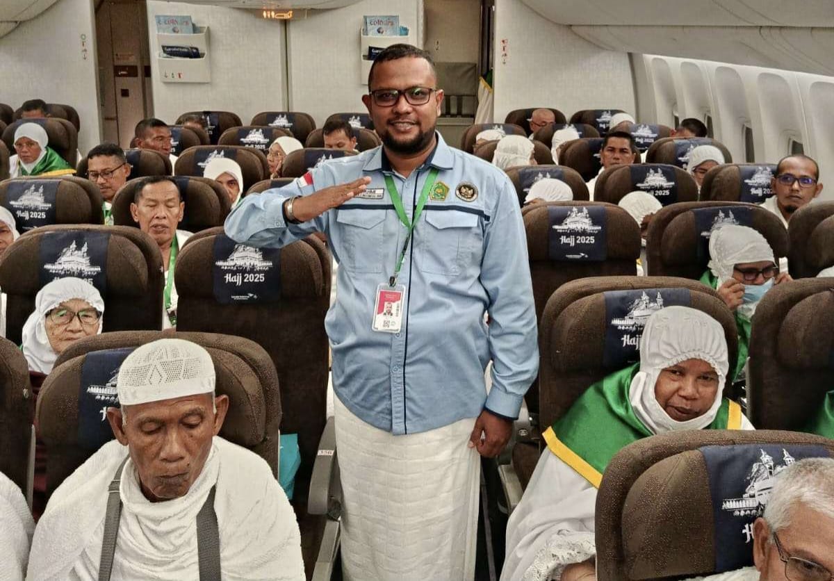 Ketua Kloter 10 Zulfahmi serta jamaah haji jelang take off dari Bandara SIM, Selasa (27/5/2025) malam. FOTO/MCH ACEH