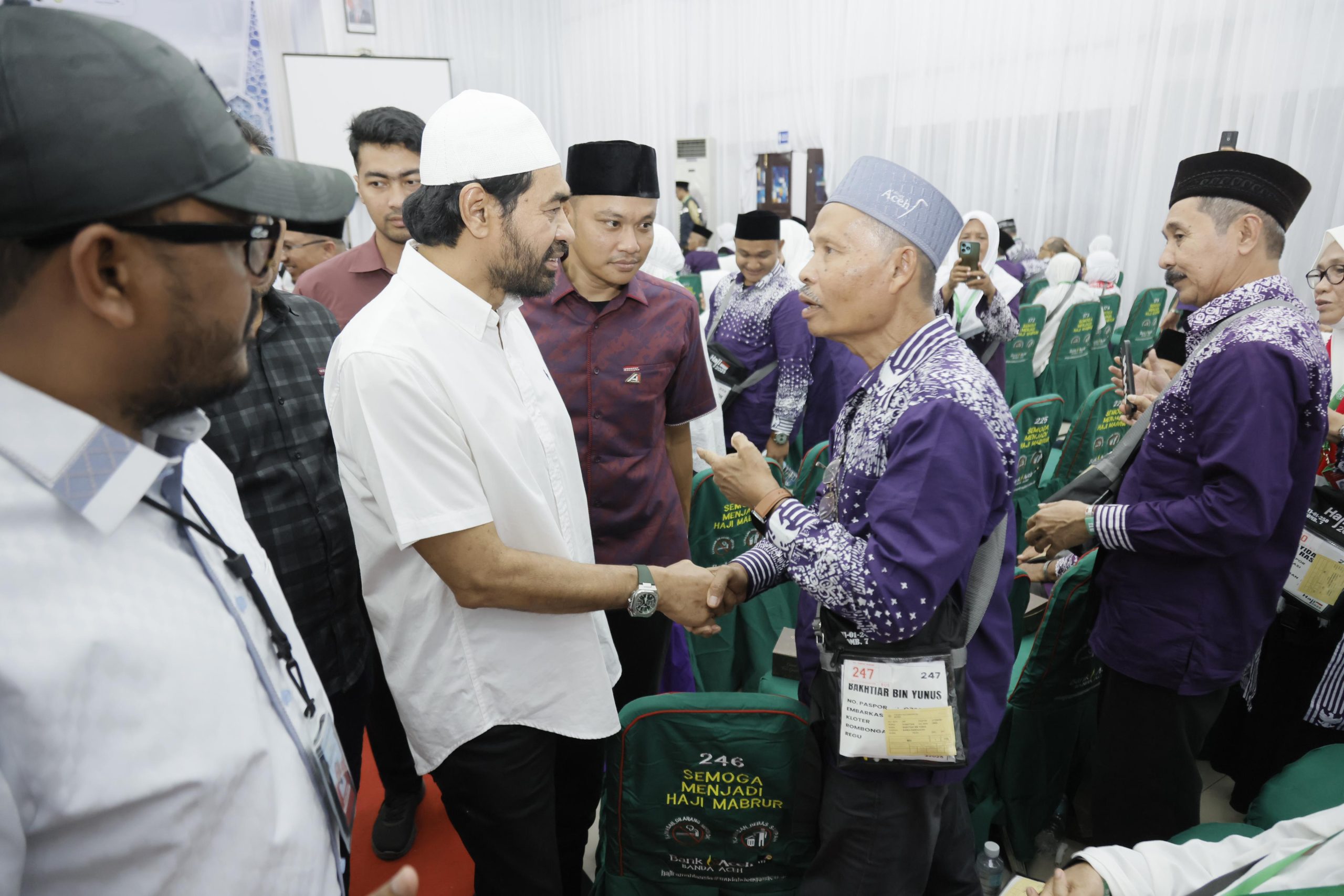 posaceh.com, Banda Aceh – Gubernur Aceh, Muzakir Manaf, atau akrab disapa Mualem menghadiri acara pelepasan pemberangkatan jemaah calon haji (JCH) Embarkasi Aceh kloter pertama Tahun 2025, di Aula Jeddah Asrama Haji Banda Aceh, Sabtu (17/5/2025).