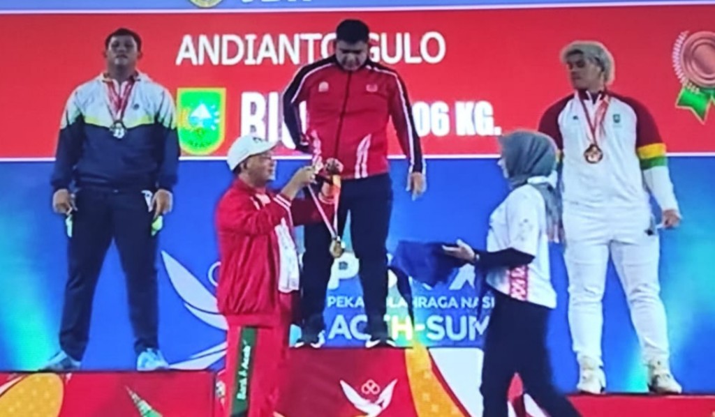 Medali emas ke lima Aceh dipersembahkan angkat besi melalui lifter Bambang Wijaya di kelas 81 kilogram putra yang turun bersaing, Jumat (6/9) di Seuramoe PABSI Aceh, komplek Stadion Harapan Bangsa, Banda Aceh.