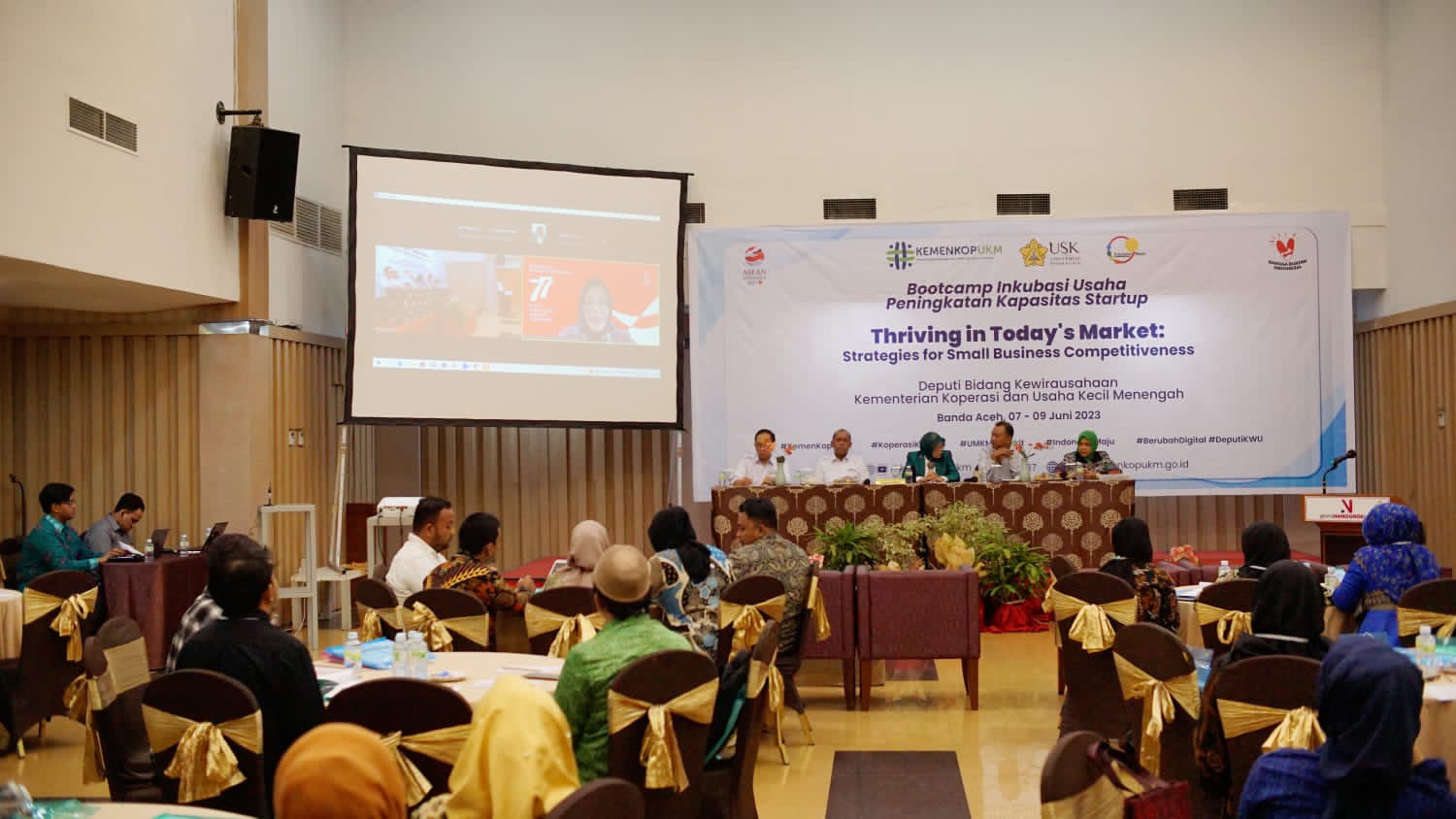 posaceh.com, Banda Aceh – Inkubator Bisnis Universitas Syiah Kuala bekerjasama dengan Kementerian Koperasi dan UKM (Kemenkopukm) RI menyelenggarakan Bootcamp Peningkatan Kapasitas startup tahun 2023 dengan Tema “Thriving in To Day’s Market: Strategies For Small Business Competitiveness”. Kegiatan yang dimulai sejak tanggal 07-09 Juni 2023 tersebut dibuka secara langsung oleh Deputi Kewirausahaan Kementerian Koperasi dan UKM Ir. Siti Azizah MBA melalui zoom bertempat di Hotel Grand Nanggroe, Banda Aceh, Sabtu (10/05/2023)