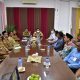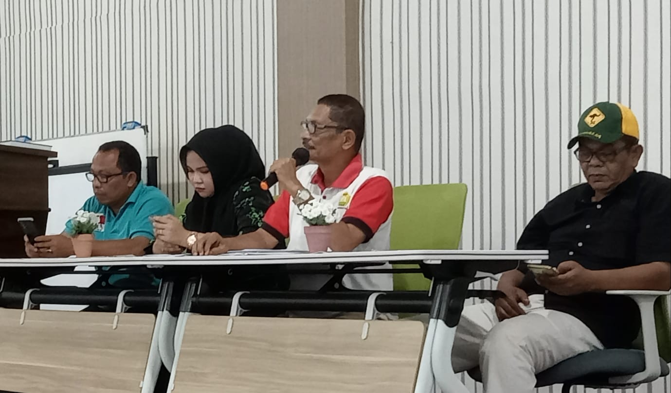 Ketua Pelatda KONI Aceh 2022, Drs Bachtiar Hasan, M.Pd (kaos merah putih) menyampaikan arahan kepada para pelatih pada evaluasi dan hasil tes fisik Pelatda di Hotel Garuda, Banda Aceh, Senin (1/8/2022) malam. Foto : Sudirman Mansyur.