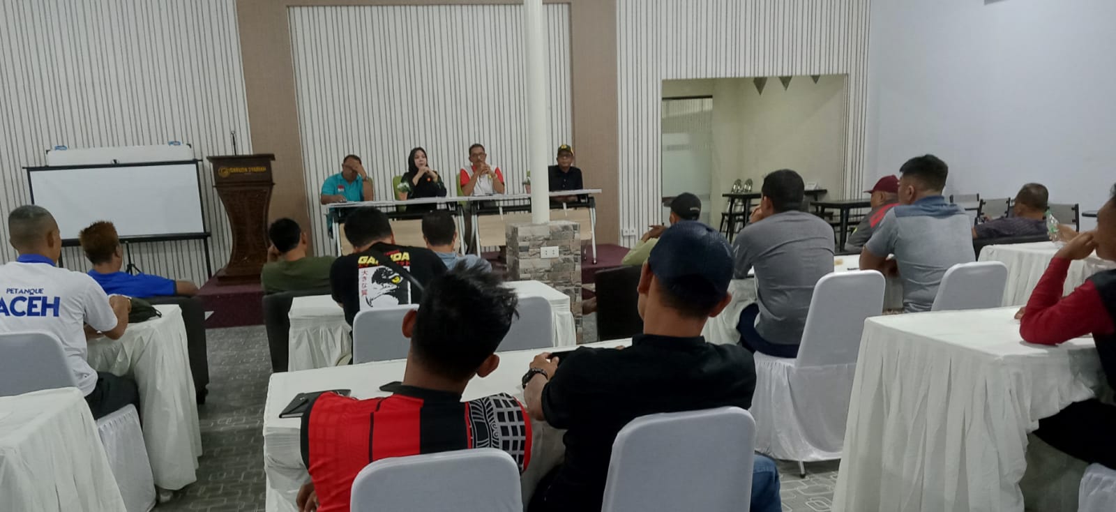 Ketua Pelatda KONI Aceh 2022, Drs Bachtiar Hasan, M.Pd (kaos merah putih) menyampaikan arahan pada evaluasi dan hasil tes fisik Pelatda di Hotel Garuda, Banda Aceh, Senin (1/8/2022) malam. Foto : Sudirman Mansyur.