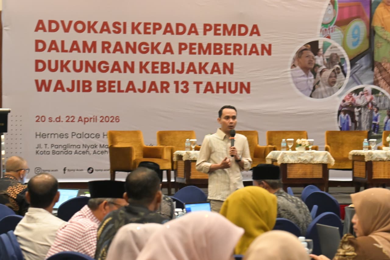 posaceh.com, Banda Aceh – Ketua Kelompok Kerja (Pokja) Bunda PAUD Aceh Besar, Hj. Nurul Fazli, S.Ag., menghadiri kegiatan advokasi kepada pemerintah daerah dalam rangka pemberian dukungan kebijakan wajib belajar 13 tahun yang berlangsung di Hermes Palace Hotel, Banda Aceh, Selasa (21/4/2026).