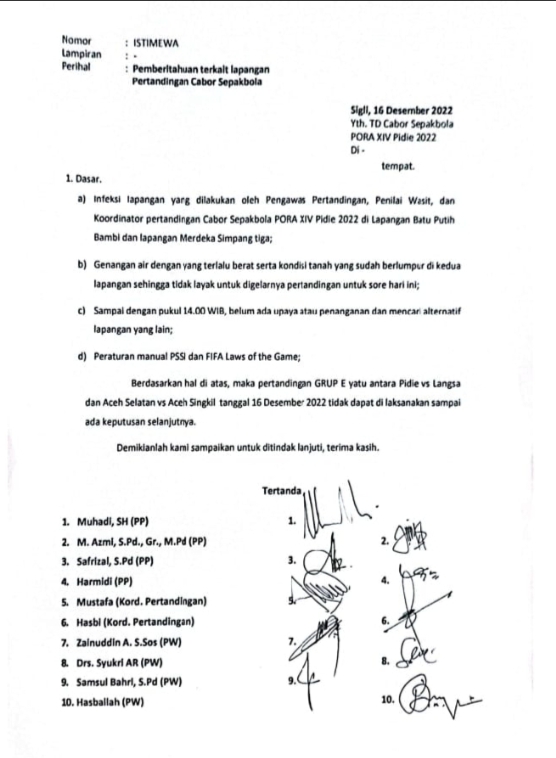 Sedangkan pertandingan yang telah dilakukan penundaan sesuai surat dikeluarkan pengawas pentadingan dan koordinator pertandingan, sementara itu untuk tim sepak bola Pidie pada laga melawan Kota Langsa harus menang jika ingin melaju ke babak semifinal.