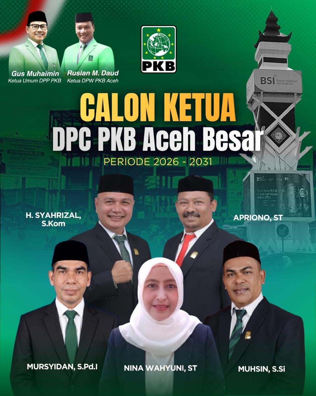 Merujuk Surat Tim Koordinator Pembentukan Kepengurusan DPC PKB Masa Bakti 2026-2031 DPP PKB Nomor: 203/TK-DPP/IV/2026 tentang Calon Ketua Dewan Tanfidz DPC PKB Se-Provinsi Aceh Masa Bakti 2026-2031 disampaikan nama-nama Calon Ketua Dewan Tanfidz DPC PKB Kabupaten Aceh Besar Masa Bakti 2026-2031 yang berhak mengikuti UKK yakni H Syahrizal, S.Kom, Apriono, S.T, Mursyidan, Nina Wahyuni, S.T, dan Muhsin, S.Si.