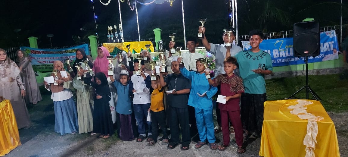 Para pemenang Aneka Lomba dalam rangka memeriahkan HUT ke-78 Kemerdekaan RI, melakukan foto bersama di halaman Meunasah Gampong Seuneubok, Kecamatan Seulimeum, Aceh Besar, Jumat (18/08/2023) malam. FOTO/ CBoy