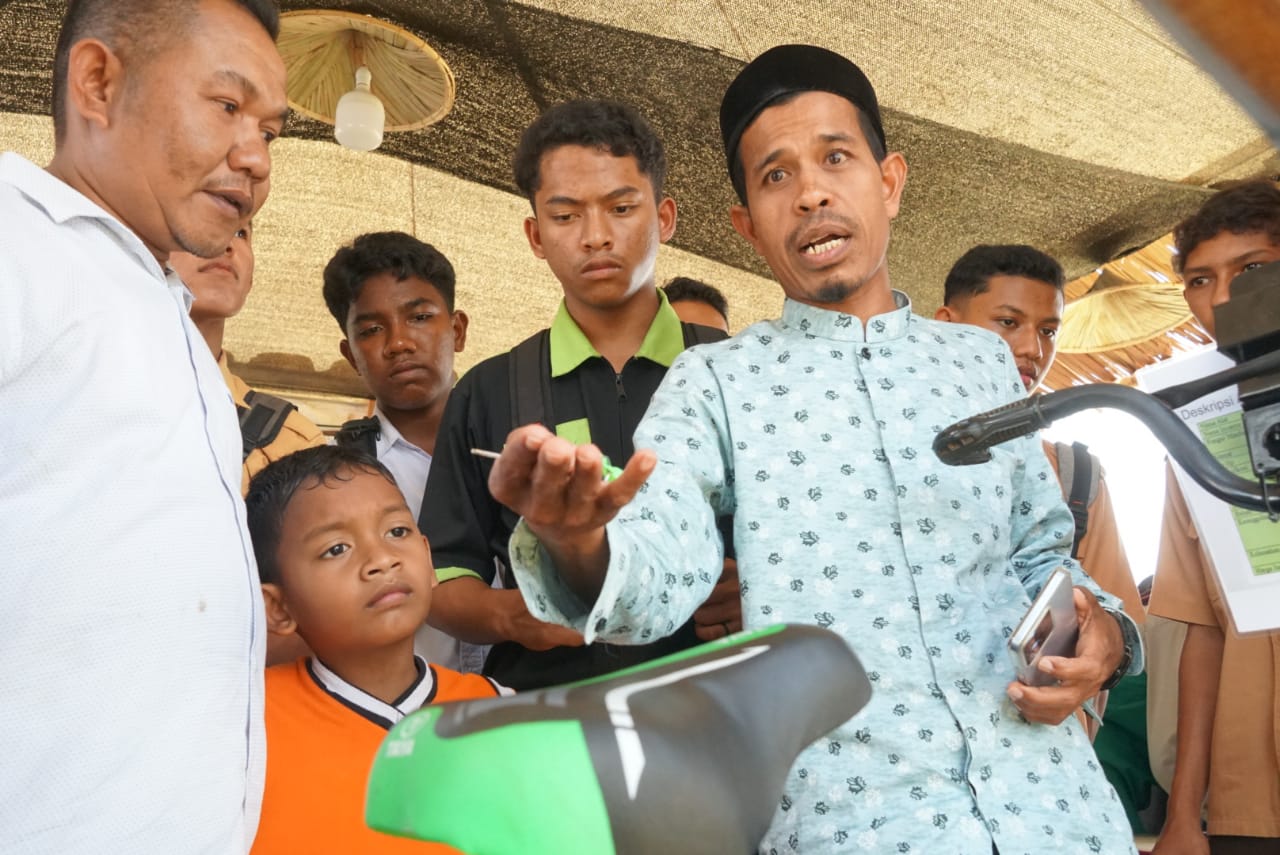 Inventor alat TTG mesin pompa air tenaga dayung, Darmawan, menjelaskan kepada pengunjung cara kerja sepeda bekas hasil rakitannya yang dimodifikasi sehingga bisa menarik air. “Ini sepeda bekas, saya rakit dengan alat bekas lainnya termasuk dinamo,” katanya.