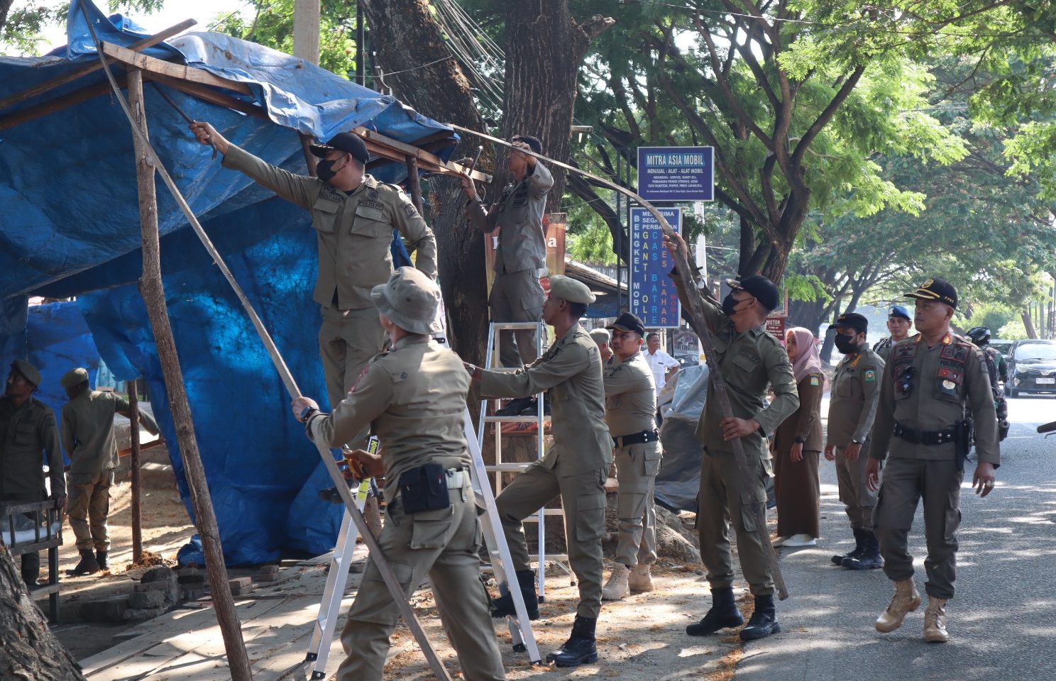 Setelah itu, petugas melakukan pembongkaran terhadap berbagai jenis bangunan non permanen seperti lapak kayu dan tenda terpal yang dinilai melanggar aturan.