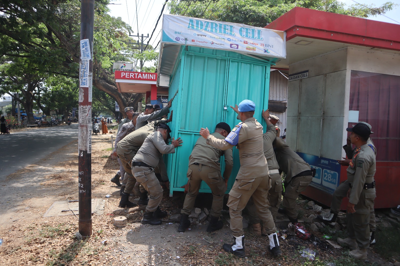 Di lapangan, petugas masih menemukan berbagai bentuk bangunan liar yang digunakan sebagai sarana berdagang. Mulai dari lapak ikan, penjual minuman, kios kelontong, hingga bangunan tambahan seperti tenda dan kanopi yang berdiri di atas badan jalan maupun bahu jalan.